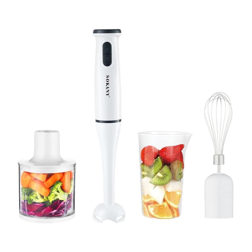 طقم متكامل باللون الأبيض يجمع بين الأدوات الأساسية للمطبخ في جهاز واحد عملي وفعال: مطحنة، هاند بلندر، مضرب البيض، دورق، ومفرمة طعام. تصميم أنيق يوفر عليك الوقت والمساحة ويساعدك على تحضير وصفاتك بكل سهولة واحترافية.